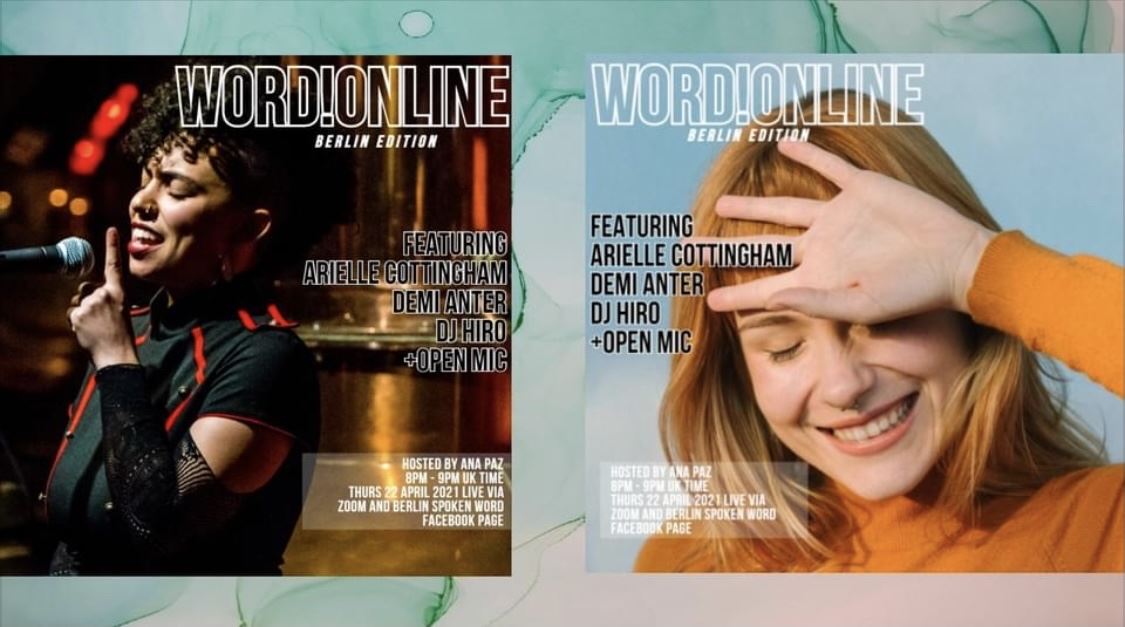 From Berlin with love... This month join us for a special Berlin edition of WORD!Online, hosted by Ana Paz and featuring the Berlin based Demi Anter and Arielle Cottingham. Also featuring a 'lucky dip' open mic, and fire beats throughout from Leicester based DJ, Hiro.