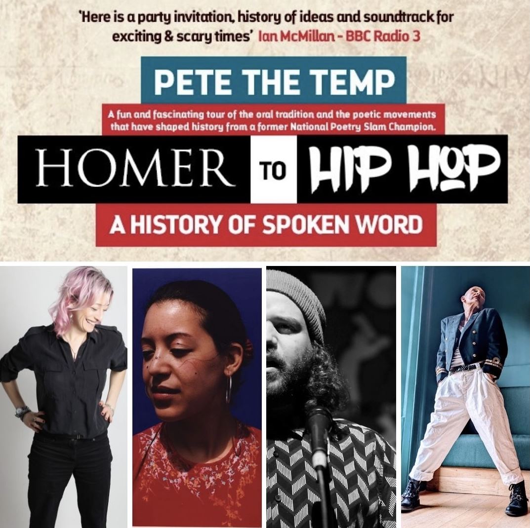 Pete the Temp will give a talk on performance poetry pioneers, voices to celebrate and what he uncovered when writing his groundbreaking book Homer to Hip Hop which charts eras and movements in spoken word. A former National Poetry Slam Champion, he has appeared on BBC Radio 4, The World Service, and Newsnight and performed around the world with organisations such as The British Council. ‘This is the book we have all been waiting for as we live through an unprecedented growth in the popularity and vitality of the poetry that revitalises the air we breathe’ www.petethetemp.co.uk